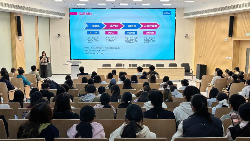 会上,朗天制药人力资源部杨经理全面介绍了公司发展历程、生产布局、核心业务与人才培养体系,详细讲解了原料药生产、质量检验、技术研发等实习岗位的职责要求。在互动答疑环节,杨经理重点围绕岗位轮岗培养、GMP实操实训、实习期间的考核标准、薪酬福利及转正留用机制等内容进行了耐心细致的解答,为大家规划实习就业方向提供了实用指导。现场交流氛围热烈,同学们积极提问、主动交流,进一步加深了对企业及相关岗位的了解。