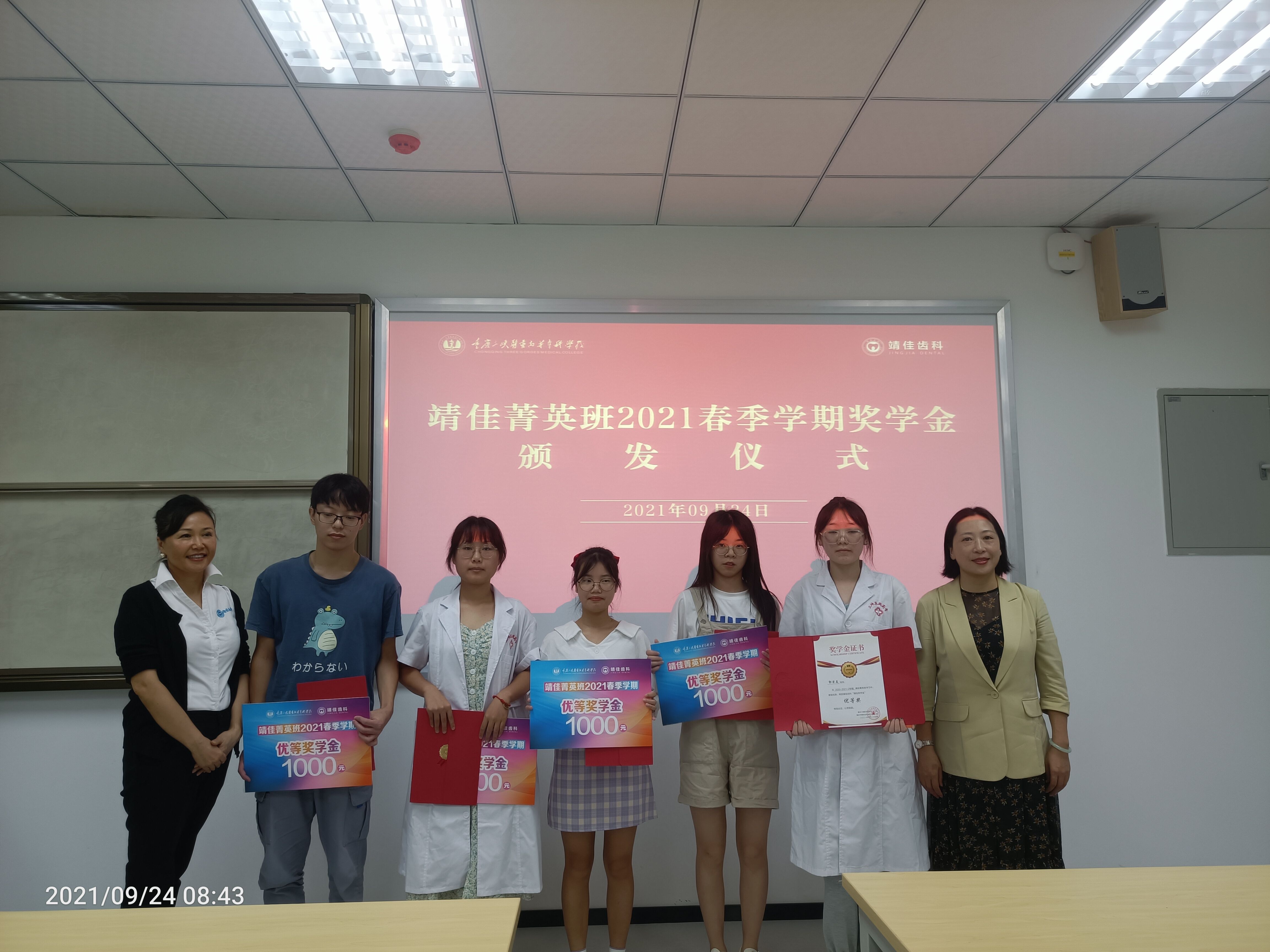 此次奖学金名额共8个,约占班级总人数40%,其中优等奖5名(1000元/人),特优奖3名(2000元/人)。此次颁奖活动表明,企业奖学金机制推动了学生学习的积极性。同时,经过此次互动,我院与重庆靖佳齿科再次达成共识——将不断探索校企合作的新模式、丰富校企合作内容,双方竭力利用优势资源为学生的发展与学习提供更多机会。