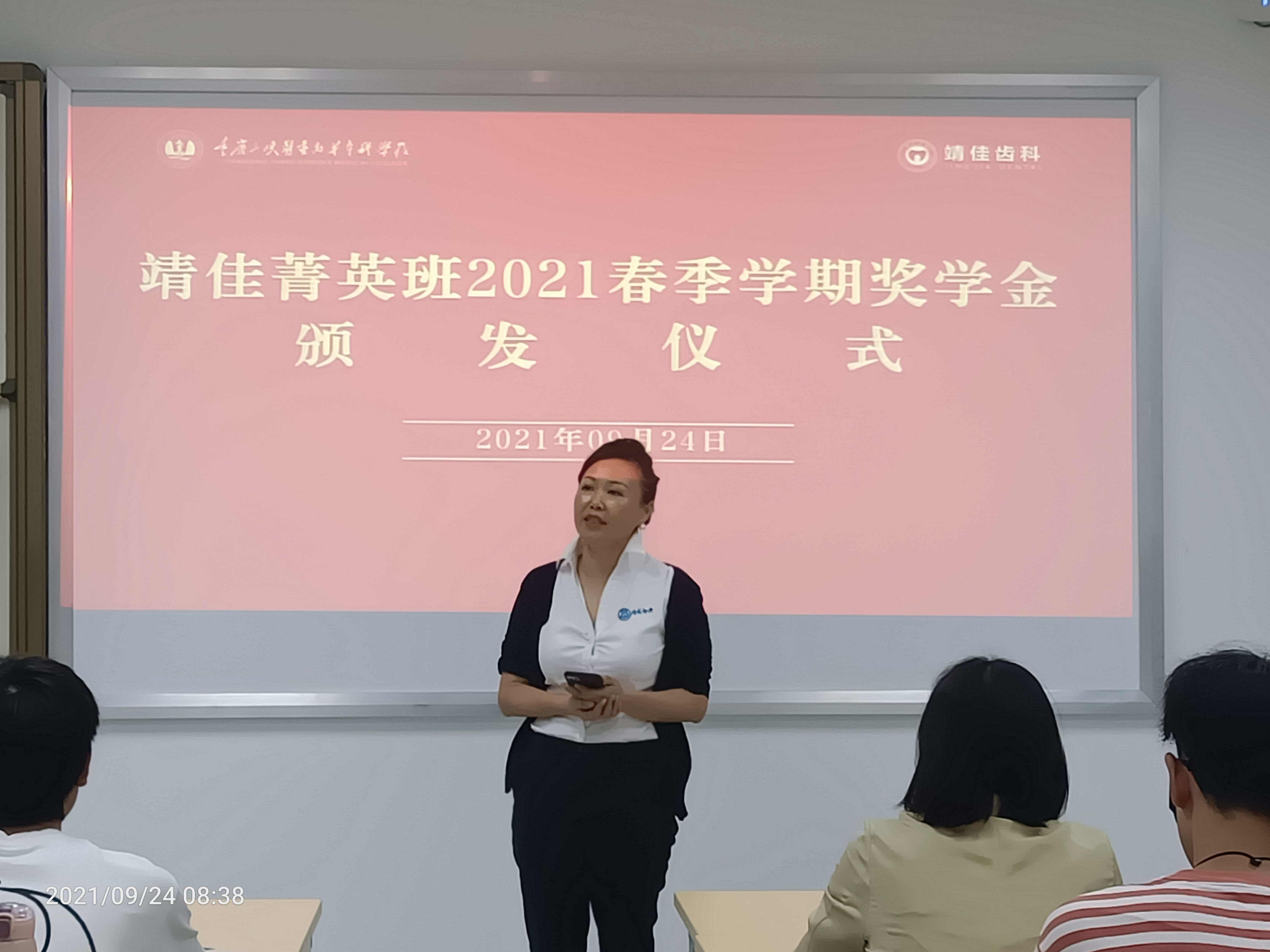9月24日,医学技术学院与重庆靖佳齿科技术有限公司在B2实训楼联合举行“靖佳精英班”2021年春季学期奖学金颁发仪式。重庆靖佳齿科技术有限公司董事长石皓婷、部长梁怡,医学技术学院书记罗玉琳、口腔医学技术教研室老师和“靖佳班”全体学生参加。