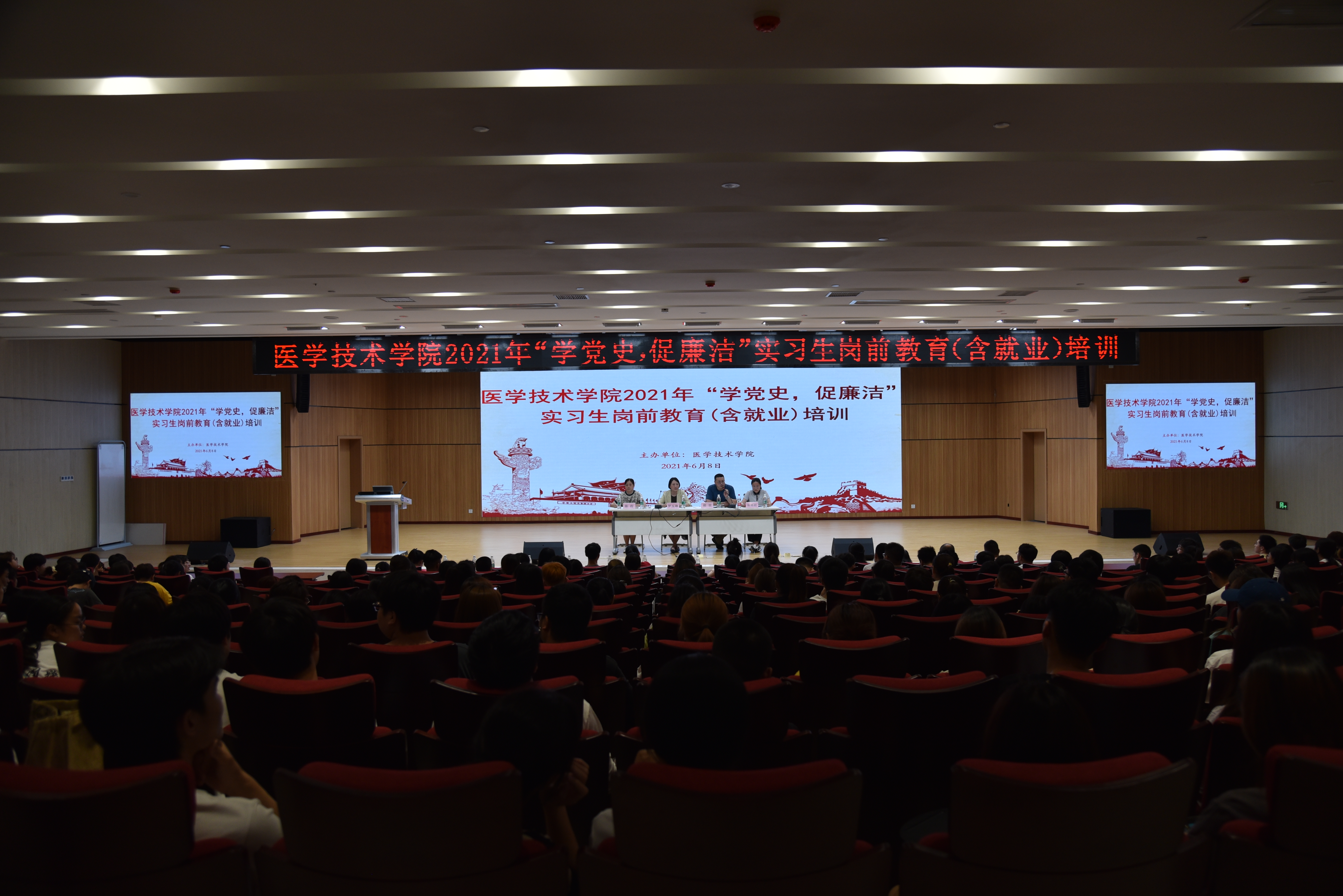 为进一步贯彻落实学校关于党史学习教育宣讲的工作要求,强化医学生爱岗敬业、廉洁自律教育,做好就业引导及技能培训,规范实习管理,6月9日晚,医学技术学院在四教学术报告厅开展了2019级学生实习岗前教育培训。会议由学院副院长郝坡主持,学院专业组负责人、专兼职辅导员参会,来自2019级各班班委、寝室长及学生代表共计350余名同学接受培训。