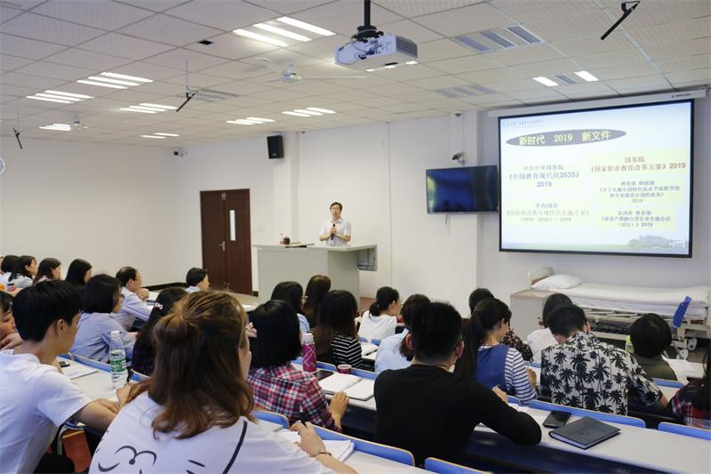 2019年1月,国务院印发了《国家职业教育改革实施方案》(简称《职教20条》),为职业教育发展指明了方向,职业教育从此迎来了发展的春天。为了进一步学习领会文件精神,2019年4月23日学校党委委员、副校长沈力教授莅临护理学院,为全院教职工及学生入党积极分子上了一次主题为《面对新形势,实现新作为——谈< 职教20条>的学习与思考》的具有特殊意义的思政课。会议由护理学院党总支书记罗玉琳同志主持。