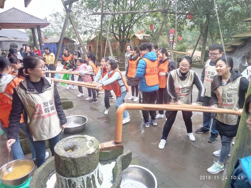拓展训练在合川友军青少年综合实践科普教育基地举行。上午,开展的是一系列生活体验活动,导师和学生团结协作,一起推石磨磨豆浆,一起舂石舀打糍粑,一起摘蔬菜做柴火饭。在欢声笑语中既体验了“自己动手、丰衣足食”的成就感,也增进了师徒情谊和团队友谊。下午以团队合作活动为主,“不倒森林”“我们是最优秀的团队”“挑战极速60秒”“水到渠成”“毛毛虫大作战”等一个个既残酷、又好玩的项目,让师徒们的团队精神得到迸发,大家都不言放弃,越战越勇。每完成一个项目后,都要进行教官讲评、小队讨论、集体总结,使体验凝练成经验、经验升华为理念,全体师生都顺利通过了“团队精神”这重要的一课。