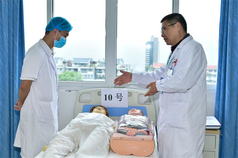 4月14日、21日全天,理论一、二单元和技能第一、三站(病史采集、案例分析、辅助检查判读)以笔试形式圆满完成。 4月15日全天、22日上午,技能第二站(实操)考核在我系临床实训中心及护理实训室顺利进行。按照国家执业助理医师“三站式”技能考试要求,技能考核安排了胸腔穿刺、洗手、戴手套、穿无菌手术衣、穿刺和缝合、换药和拆线、心脏检查、胸肺检查等共计14个组合项目(28个单项操作)。附属医院经验丰富的骨干教师及万州区人民医院的14名优秀兼职教师担任考官。