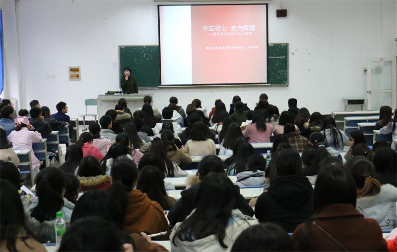 按照学校党委“十九大精神进校园”宣讲要求,进一步引领护理系青年大学生深入学习领会十九大报告精髓,12月12日下午2:00,护理系党总支书记罗玉琳同志在二教101教室为护理系全体团学干部近200人作了“十九大”专题宣讲,讲座持续2个小时,同学们全程专注,反响热烈。