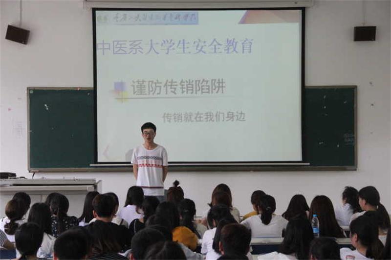 由于大学生缺乏防范传销意识,近年,有许多高校学生误入传销组织。为了避免学生在暑假期间再陷入传销陷阱, 2017年6月27日,中医系在二教201举办了“打击传销,共建和谐,从我做起”的反传销宣讲活动。中医系打击传销工作正式展开。