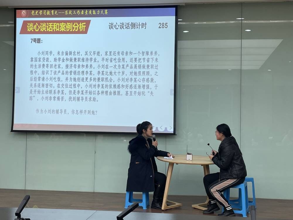 大赛包括基础知识测试、理论宣讲和谈心谈话及案例分析三个阶段。第一阶段重点考察辅导员的理论素养和业务知识,重点是习近平新时代中国特色社会主义思想、十九届六中全会精神、全国及全市教育大会精神、党和国家关于大学生思想政治教育的相关要求等。以赛代训、以赛促学,进一步夯实了全体辅导员的理论基础。