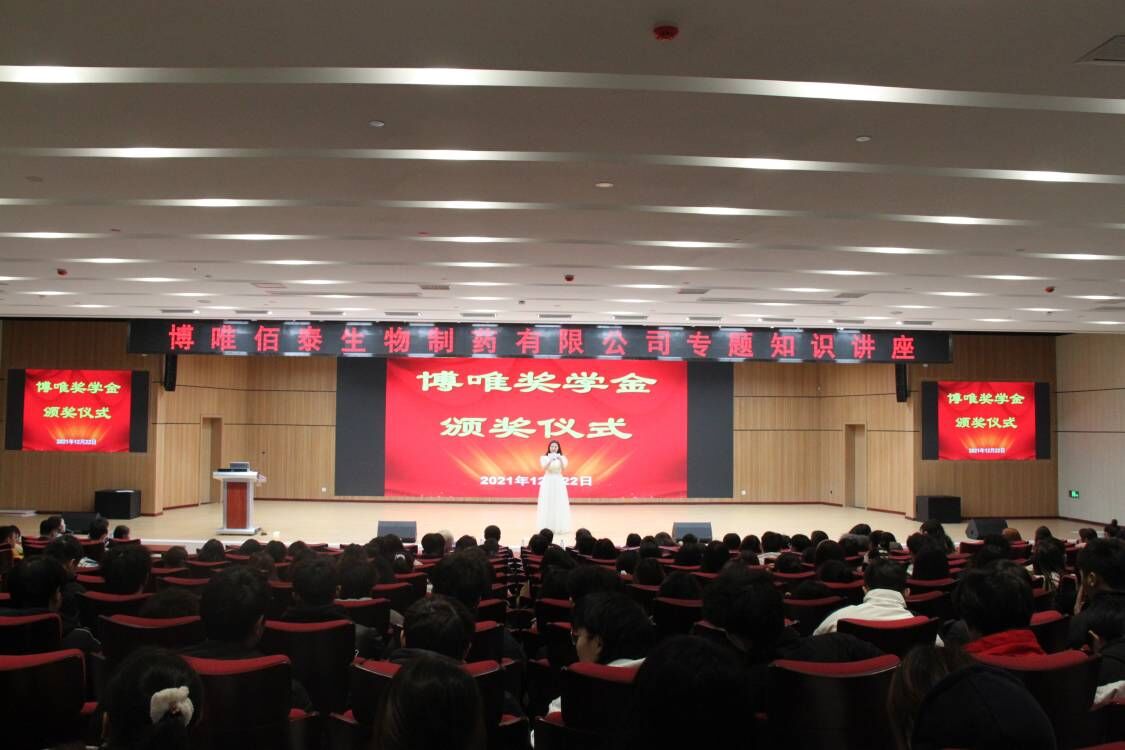 会议伊始,郝坡为本次仪式致辞,对陈佩新一行的到来表达了热烈的欢迎。解植太从公司背景、产业化平台、企业荣誉等方面对公司的情况进行介绍;陈佩新为同学们带来疫苗基础知识及行业发展概况的精彩讲座,使同学们更直观、准确地了解医学生物技术专业的现状和发展前景,激发同学们对专业的学习兴趣。讲座后,双方领导共同为获奖学生颁发奖金和证书,获奖学生代表上台分享了博唯班学习的经历与感悟;最后,郝坡对此次活动作了总结,他代表学校感谢博唯公司作为行业优秀企业参与到学校的人才培养中来,并希望公司和学校的合作能往更深、更广的领域发展。