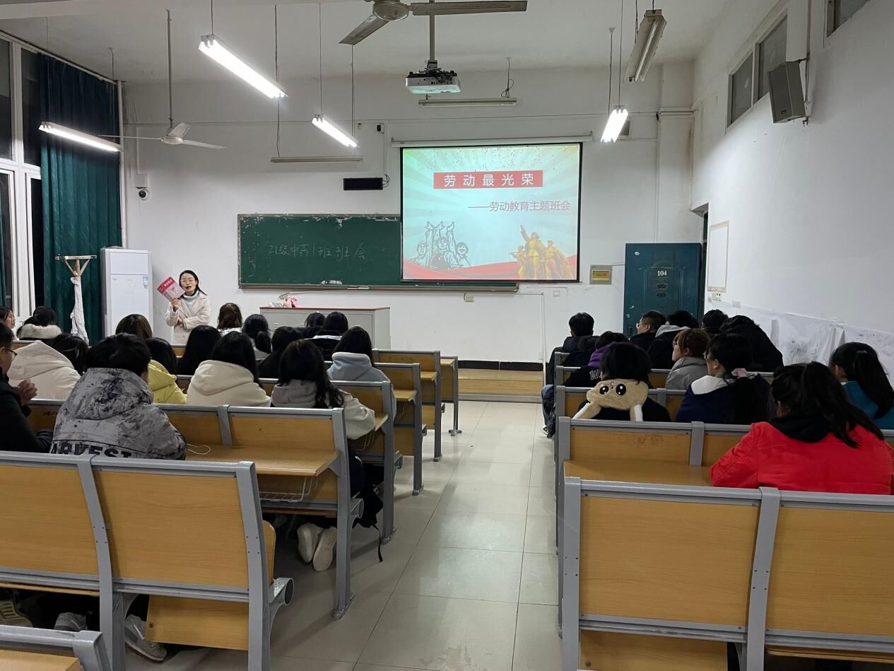 主题班会以”学院牵头备课,班级分散开展”的方式进行。11月11日-19日,各班陆续开展劳动教育主题班会。2021级中药学1班辅导员汪庆玲老师结合学院课件,融合教学方法,活用班级日常管理中的案例,例如:背送生病的同学看病、主动打扫班会后的教室卫生。通过“讲身边事,赞身边人”,达到“学榜样,做榜样”的效果,既增强了同学之间的相互了解,营造了积极向上的班风,也生动地将劳动教育落地到身边的具体行动中,让同学们有抓手、有突破口地落实劳动教育。