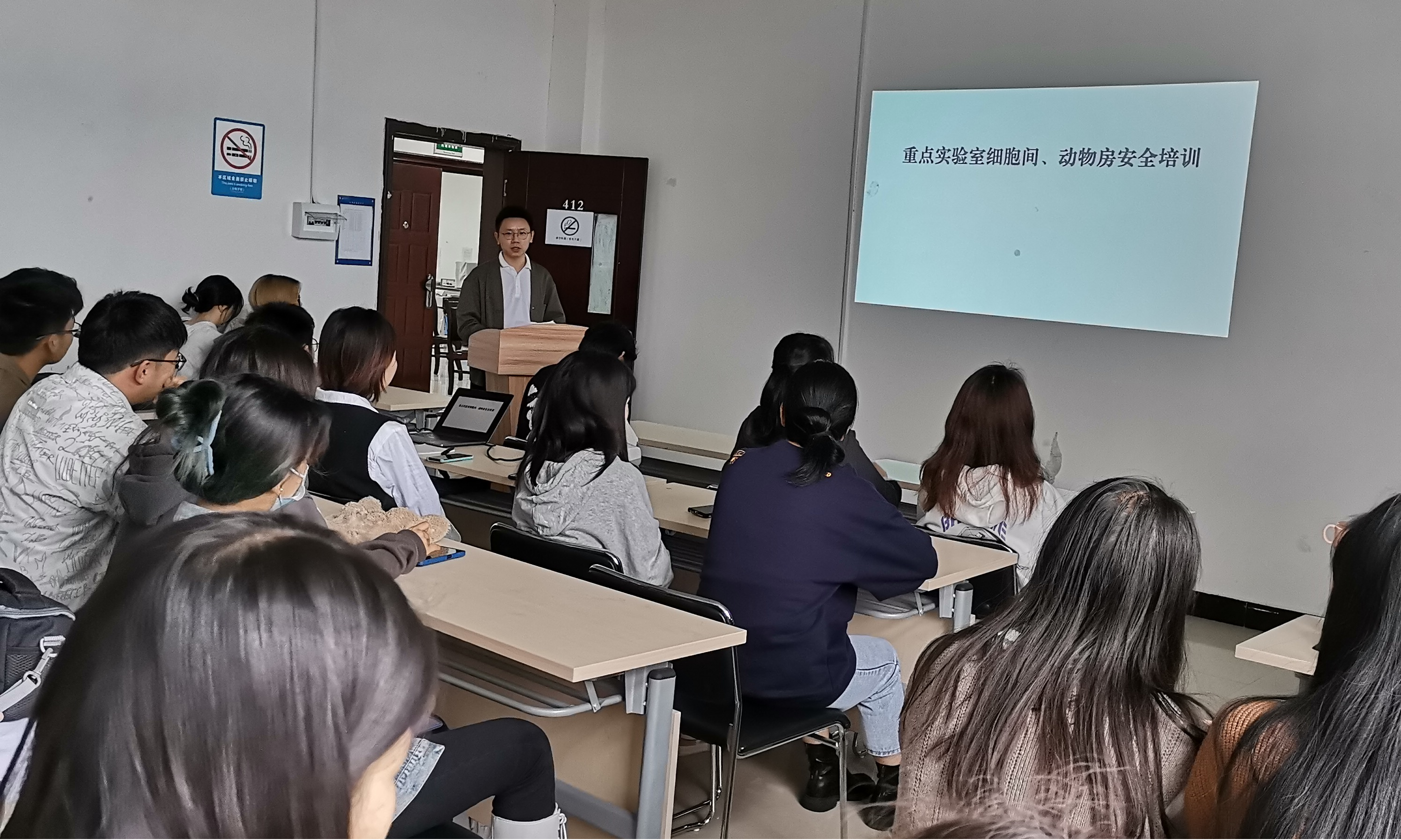 为进一步规范重点实验室细胞培养室和动物暂养间管理,加强师生对实验室仪器设备的熟练程度,提高师生的安全意识和法律意识,促进重点实验室的高效运转,4月14日下午,重点实验室开展了实验室安全培训。本次培训由重点实验室唐加峰老师主讲,基础医学部全体教师、本科生及勤工助学学生等80余人参加。