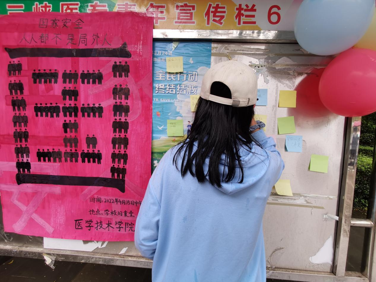 为深入贯彻落实习近平新时代中国特色社会主义思想和党的十九大关于总体国家安全观、国家安全工作的部署,在我国第七个全民国家安全教育日到来之际,医学技术学院于4月15日中午,在校园杏林大道组织开展了以“国家安全,人人参与,人人可为”为主题的宣传教育活动,引导学生牢固树立总体国家安全观,提升维护国家安全的自觉性和主动性。