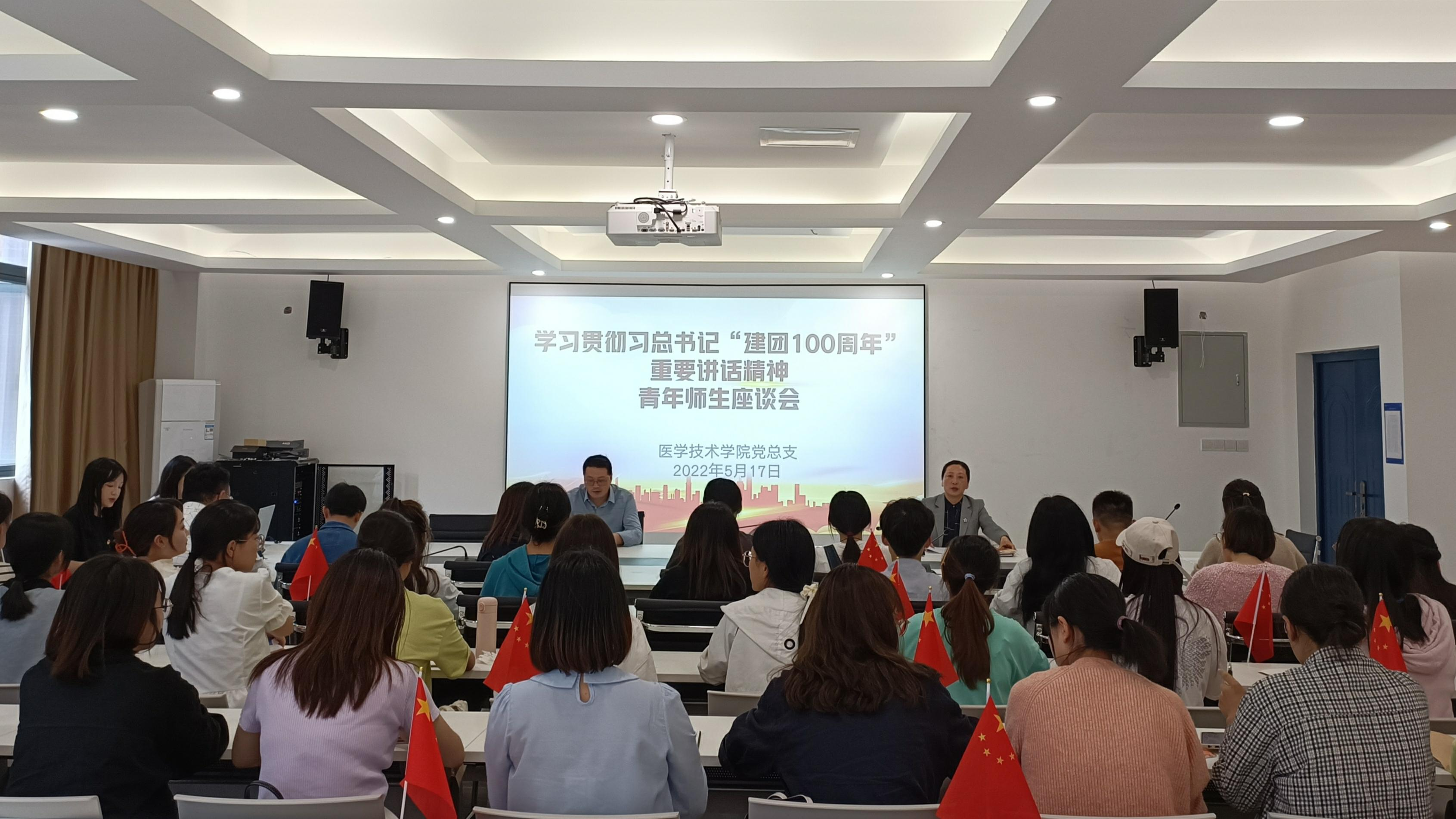 5月17日下午,医学技术学院党总支在B6-415会议室举办了学习贯彻习近平总书记在庆祝建团100周年大会上的重要讲话精神——青年师生座谈会,会议由学院党总支书记罗玉琳主持,院长郝坡、学院35周岁以下青年教师、部分学生代表共计50余人参加。