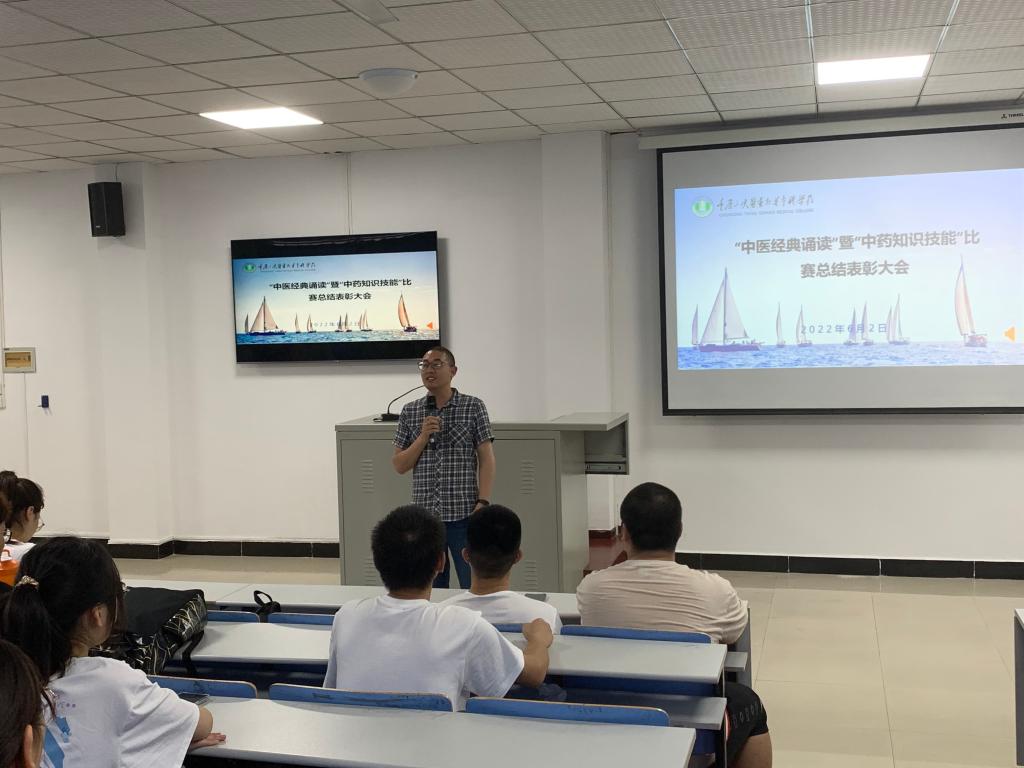 6月2日下午,中医学院在二实训楼403教室对两项比赛的获奖选手进行了表彰。中医基础教研室主任秦建设对比赛的情况作了介绍,公布了获奖名单。选手们依次上台领取荣誉证书及奖品。颁奖结束后,周冷飞雪等优秀学生代表发言,将自己的参赛体会和学习中医的方法与同学们进行了交流。