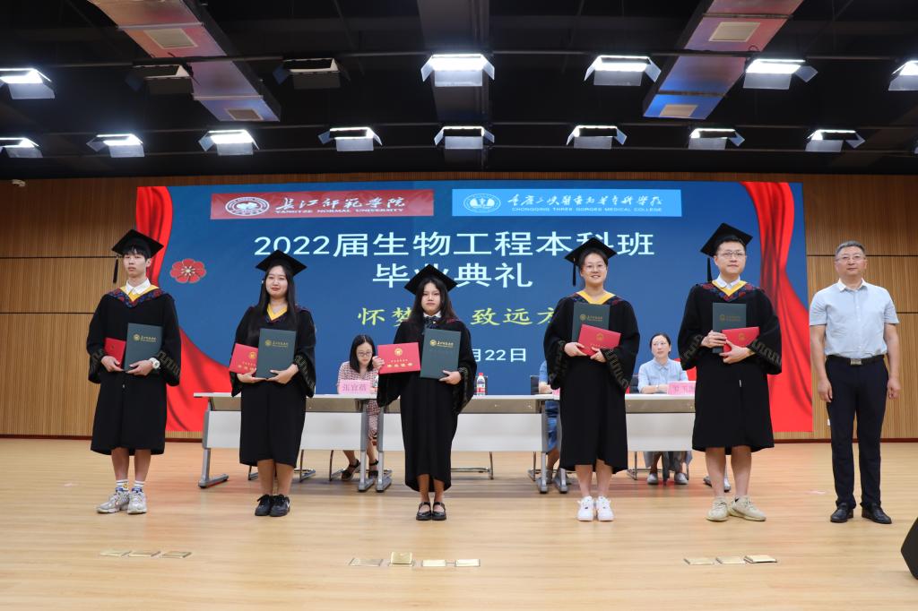 简朴又隆重的毕业典礼圆满结束。2022届生物工程本科班2020年入学以来,在学校关心下,专业上提供优质教学资源,生活上提供帮助和支持。两年来班级荣获“五四红旗团支部”荣誉称号,发展党员2人,2人获得长江师范学院“优秀毕业生”称号,班级32人考研,国家线上线人数16人,录取11人。这些成绩是学校对2022届生物工程本科班的关心关爱积累的,未来医学技术学院也将继续加强专业建设,力争培养更多人才,同时为本科转型积累更多经验。