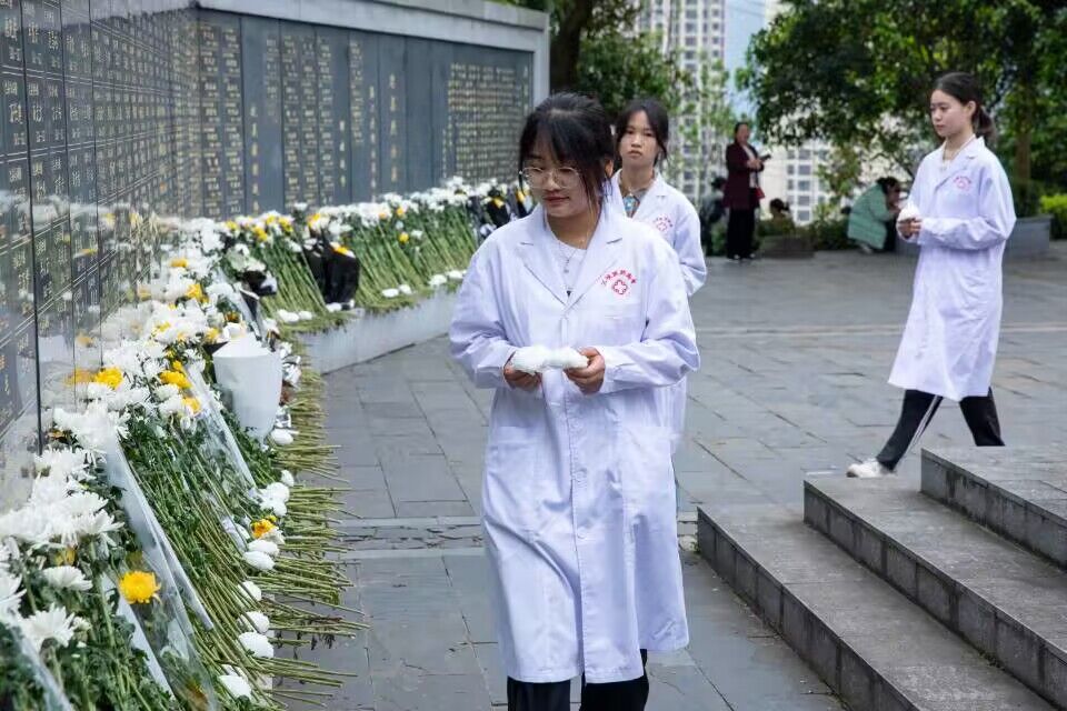 细雨纷纷寄哀思,莘莘学子慰忠魂。纪念碑前,医学生们身着圣洁的白大褂,庄严肃立,齐唱中华人民共和国国歌,并进行默哀。两名学生代表迈着坚定的步伐向烈士敬献花篮,医院党委委员、副院长刘云华细心整理缎带,全体师生依次向先烈敬献小白花,瞻仰烈士纪念碑和英名墙。这一朵朵洁白的小花,饱含着同学们的真挚情感,寄托着无限哀思。