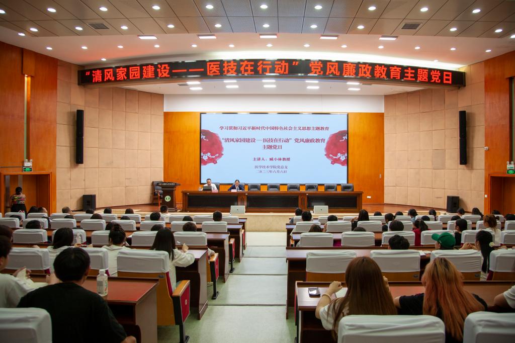 按照学校党委对学习贯彻习近平新时代中国特色社会主义思想主题教育的指导要求,医技学院党总支对照《学院主题教育实施方案》,开展“清风家园建设——医技在行动”党风廉政教育主题党日,抓住师德师风建设这个高校廉政教育的“牛鼻子”,进一步推动学习教育走深走实。6月6日,特邀请重庆三峡学院党委常委、副校长臧小林教授,在学校国际会议厅开展题为“师德引领 以德育德”的教育讲座。学院全体党员、教职工及学生干部代表共计130余人参加。讲座由学院党总支书记罗玉琳主持。