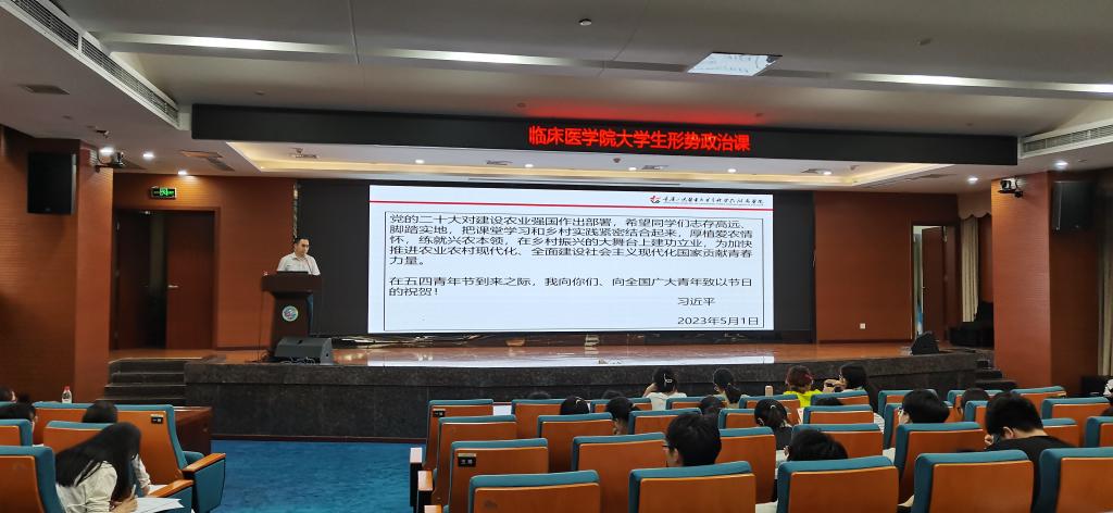 为深入开展学习贯彻习近平新时代中国特色社会主义思想主题教育,6月12日晚,附属人民医院党委书记、临床医学院党总支书记赖登祥在附属人民医院高笋塘院区综合楼学术厅,为临床医学院师生上形势政策课。附院教学基地176名同学现场聆听,临床医学院校本部及区外教学基地2000余名师生线上学习。