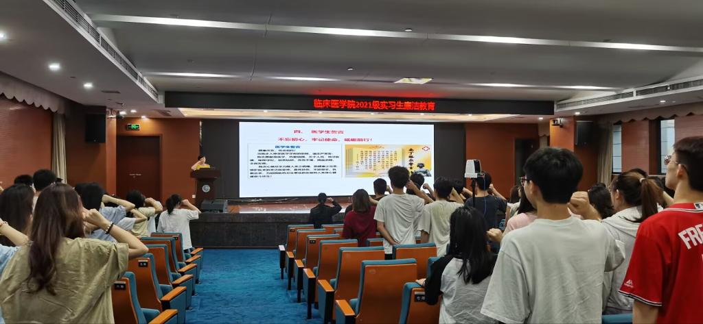 为深入开展学习贯彻习近平新时代中国特色社会主义思想主题教育,认真落实党中央《关于加强新时代廉洁文化建设的意见》精神,6月14日晚,临床医学院在附属人民医院高笋塘院区综合楼学术厅开展实习生岗前廉洁教育专题讲座,由副书记程晓莉担任主讲,附院教学基地176名同学现场聆听,临床医学院校本部及区外教学基地约1000名2021级学生线上学习。