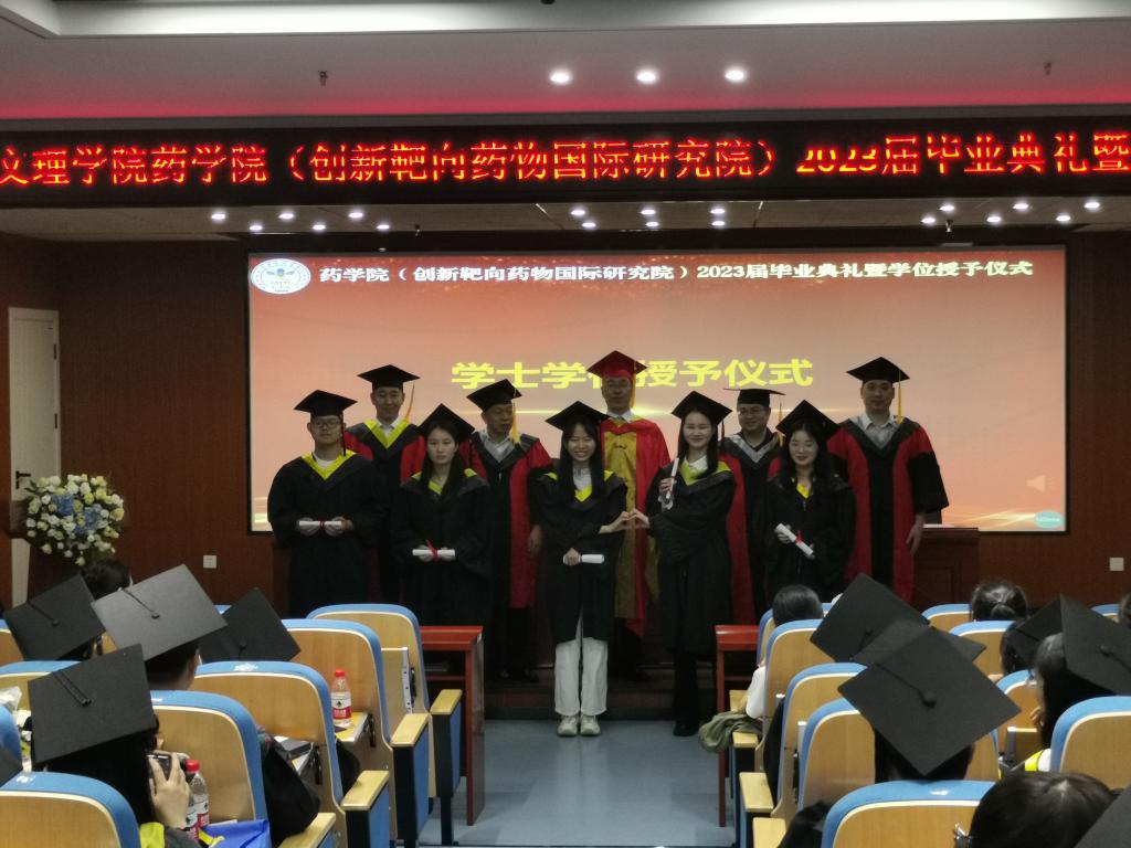 重庆文理学院药学院副院长唐典勇宣读了学校2023届毕业生学位授予决定。蔡家林、苏兴文、易东阳、唐典勇、孟江平为2023届90名联合培养毕业生拨穗正冠,颁发毕业证书并合影留念。