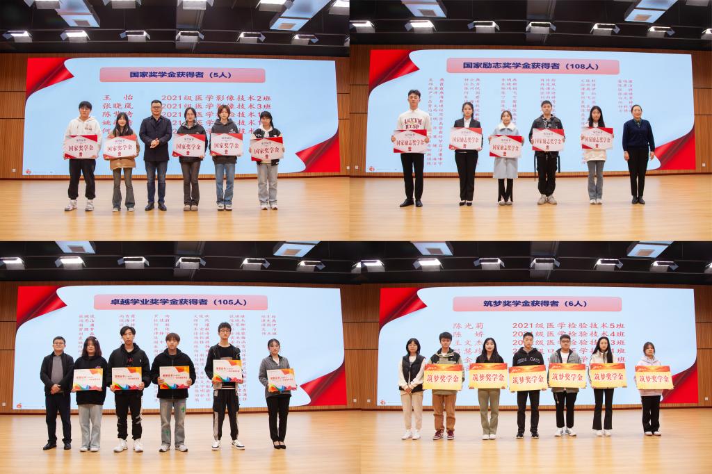 郝坡宣读2023年国家奖学金、国家励志奖学金、卓越学生奖学金、筑梦奖学金、国家助学金相关文件及获奖学生名单,学院获奖助学生1073人次、奖助金额354.4万元,体现了学校贯彻落实国家奖助政策,坚持资助工作以人文关怀为核心,以实事求是为指导,以解决学生实际问题为目标,也鼓励了医技学子学好专业课、努力在各项大赛等方面取得更大成绩的信心。张建忠、罗玉琳为奖助学生代表颁发证书,并对学生表示热烈祝贺。