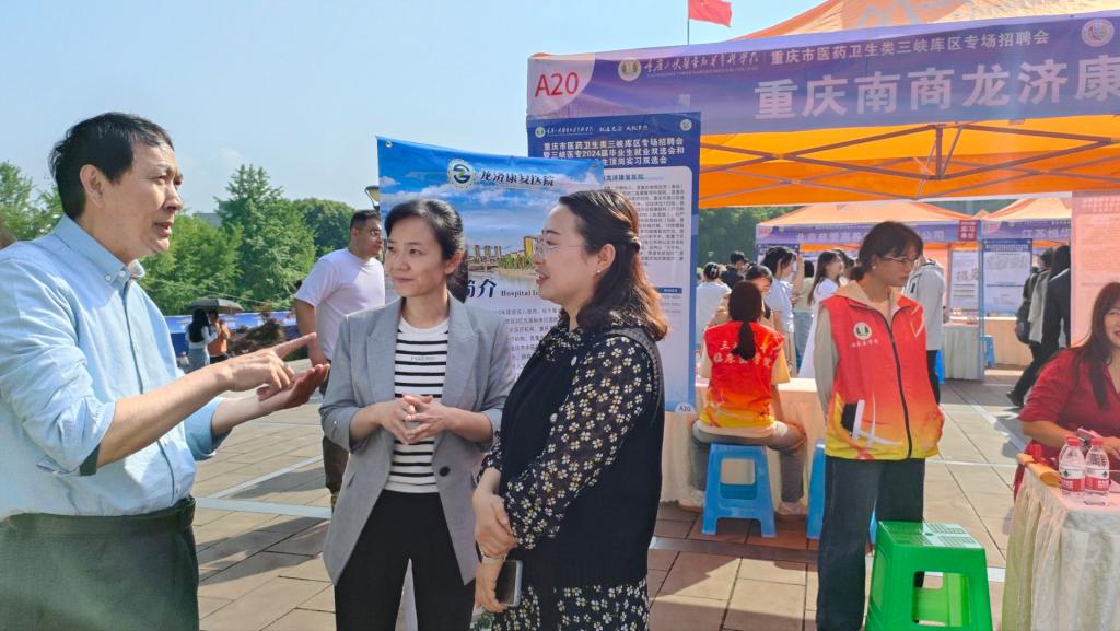 双选会期间,学院副院长张冬梅和副书记闫丽丽等学院领导深入现场,与重庆市渝东医院、四川广安邻水西南口腔医院、黔江民族医院等单位深入交流,开展访企拓岗,为学生搭建更宽广的就业平台,助力学生实现高质量就业。