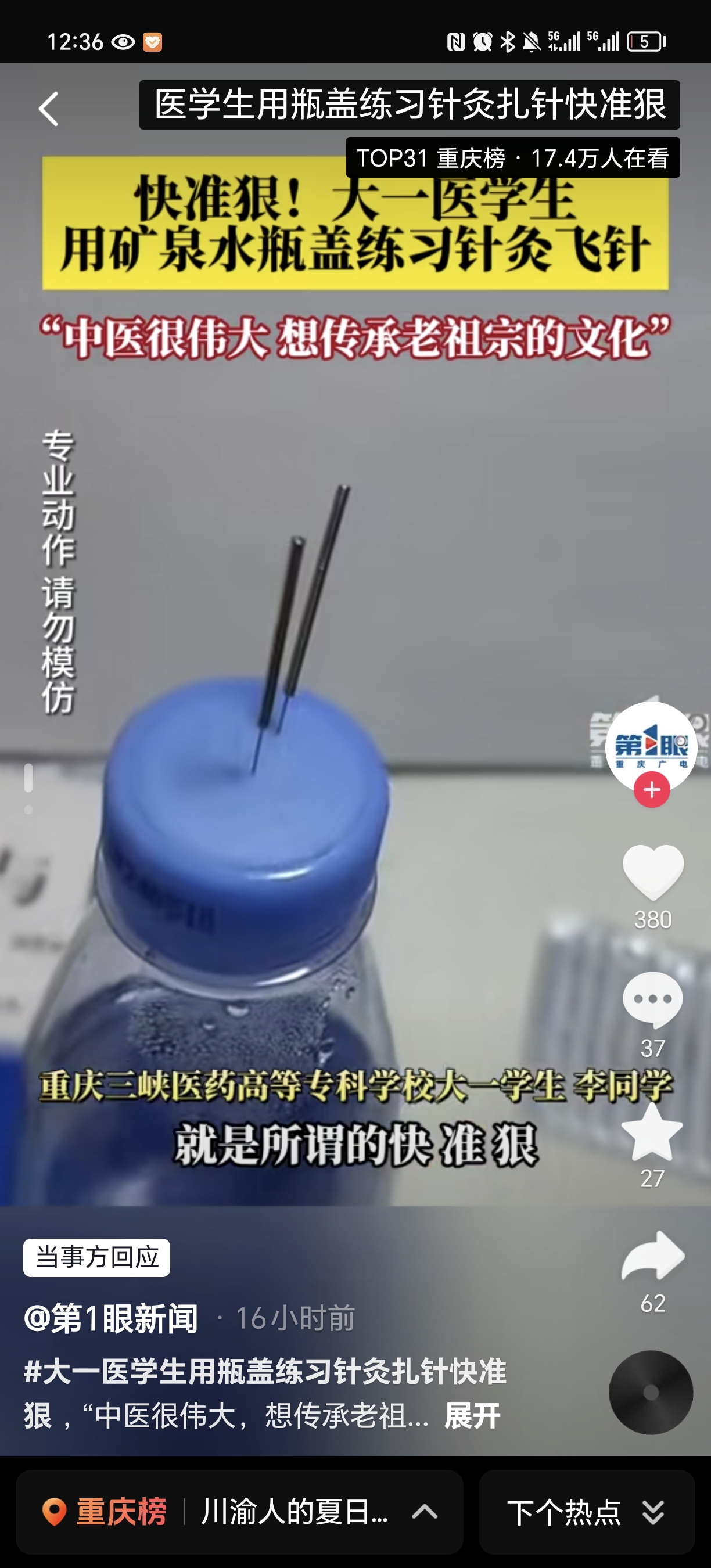 在社交媒体上,他的这一行为迅速引起了热议。有网友表示:“这位同学真是有创意,用矿泉水瓶练习针灸,既环保又实用。”也有网友称赞道:“中医文化博大精深,这位同学的精神值得我们学习。”