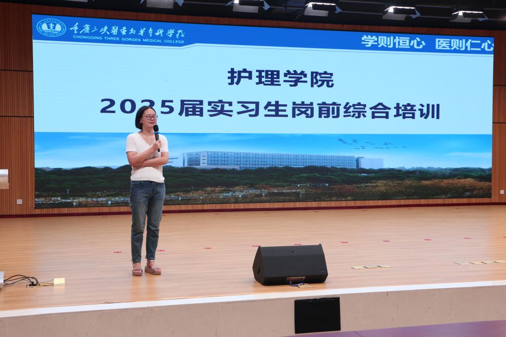 为提升2025届学生实习质量,规范实习生行为,帮助学生更快适应临床环境,更好开展临床实践,6月21日下午14:30,护理学院专职副书记李红丹在四教报告厅开展以“岗前培训促提升,逐梦前行向未来”为主题的岗前培训。学院辅导员代表及300余名学生参与了此次培训。