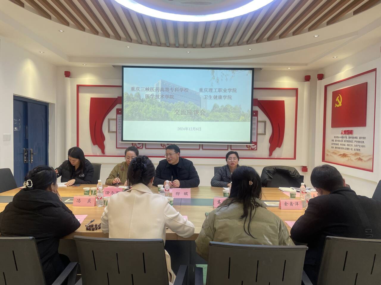 12月6日,重庆理工职业学院卫生健康学院院长董萍萍一行4人到我校调研交流。双方在医学技术学院B6-410会议室召开座谈会。医学技术学院院长郝坡、副院长蒲永莉、教务科、口腔医学技术专业骨干教师参会,会议由郝坡主持。