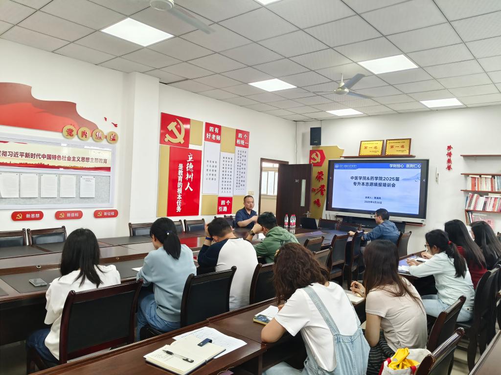 4 月 30 日,药学院与中医学院在第二实训楼 403 教室携手举办 2025 届毕业生专升本专题工作会。学校招生办公室饶清风科长应邀为两院 2022 级全体辅导员作专题辅导,21 名学工骨干齐聚一堂共商专升本工作推进策略。