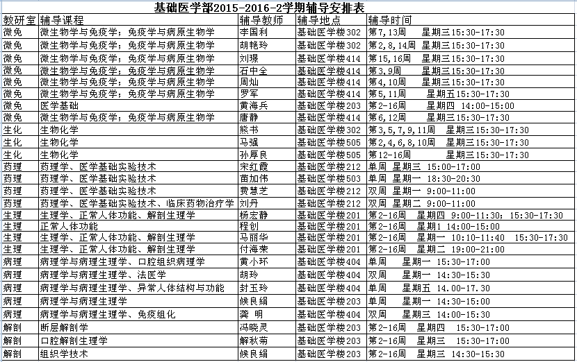 辅导答疑是教学过程中备、教、辅、改、考、研六大环节中的重要一环,是课堂教学查漏补缺、深入强化课堂教学效果的重要措施和手段。基础医学课程的教学目的是为专业课程在基础理论、基本知识和技能储备上打基础,其教学目标实现程度讲直接影响到专业课程教学进程。为保证基础医学课程教学质量,我部拟从本学期开展针对全校学生的基础医学课程课外辅导工作。各课程辅导时间安排见附件,请同学们踊跃参与多多交流。