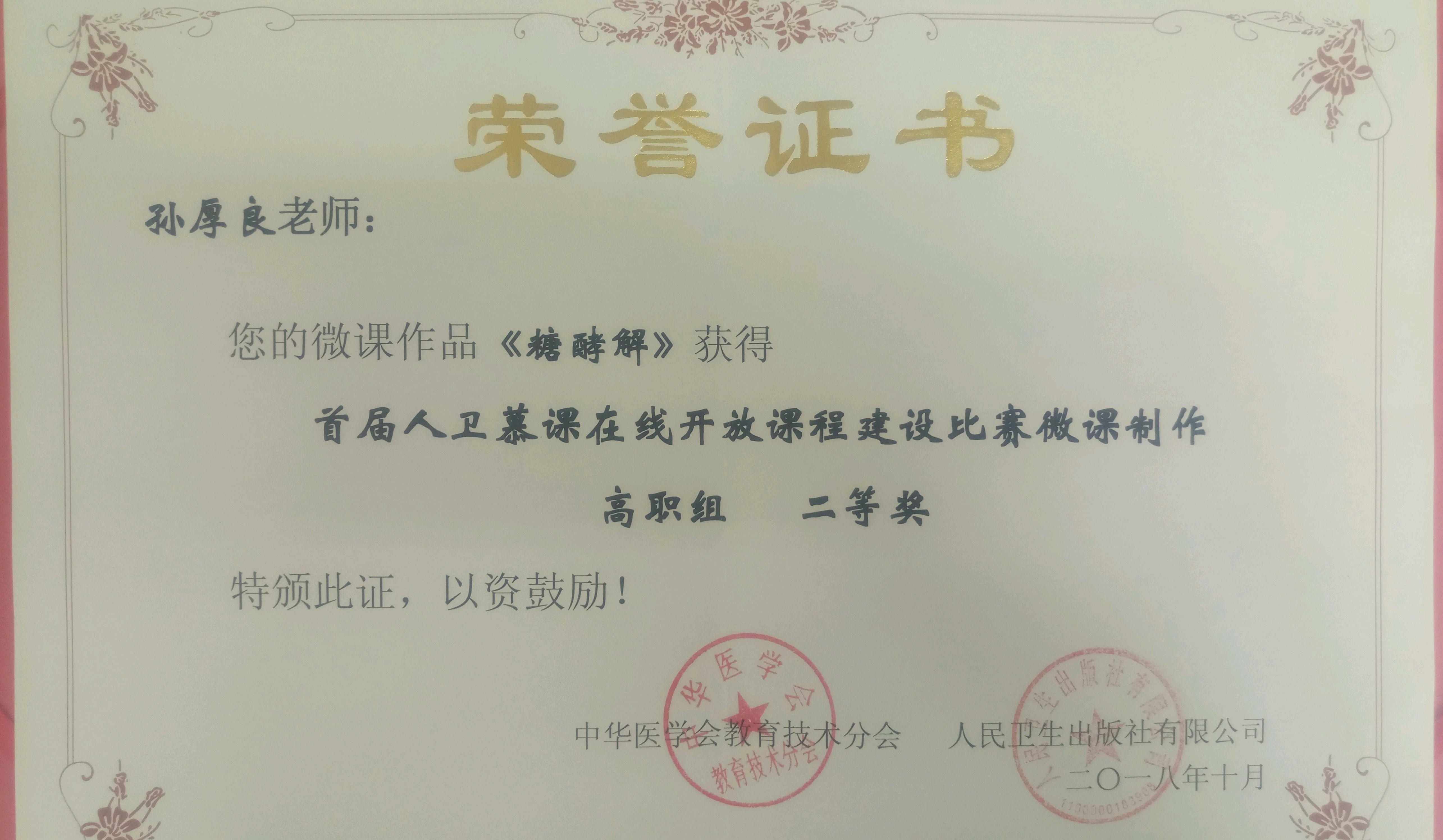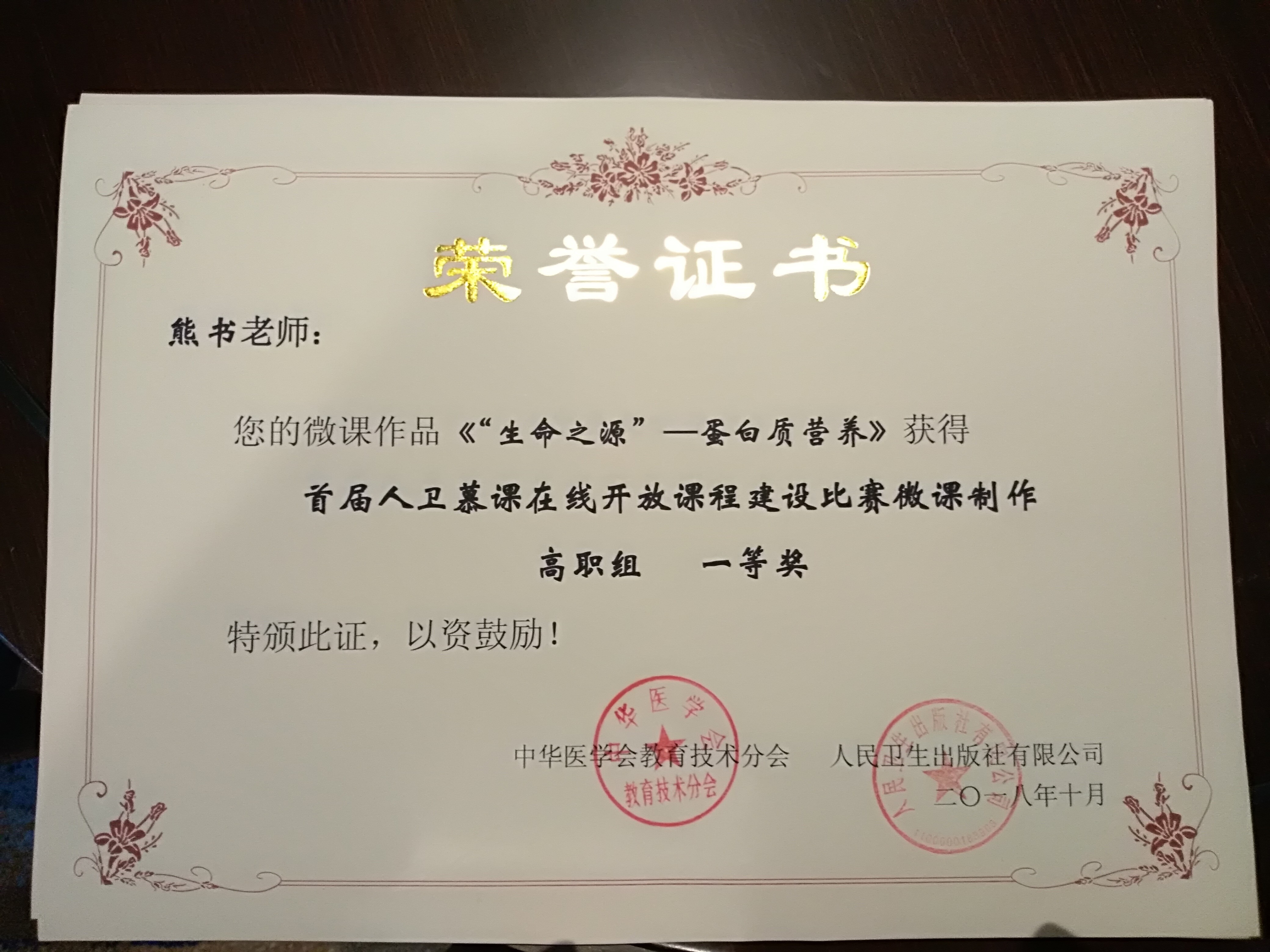 2018年首届人卫慕课在线开放课程建设比赛由人民卫生出版社与中华医学会教育技术分会联合举办。比赛于2018年4月启动,8月底截止报名。本次比赛共收到来自71所院校的参赛作品共计675个,经过资料审查、专家评分与综合评议,共评出一等奖作品5个,二等奖作品14个。经过层层选拔,激烈角逐,我部生化教研室熊书老师微课作品《“生命之源”-蛋白质营养》荣获一等奖,孙厚良老师微课作品《糖酵解》荣获二等奖。