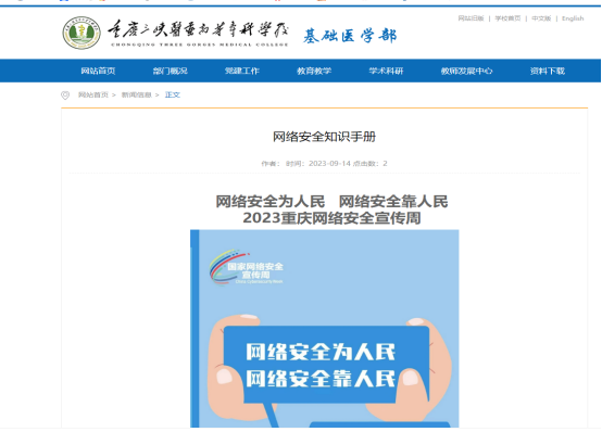 为了使全体教师更进一步明确网络安全工作的重要性,了解更多网络安全防范知识和自我保护知识,我部在部门网站发布了网络安全知识手册及网络安全宣传标语等网络安全知识信息。