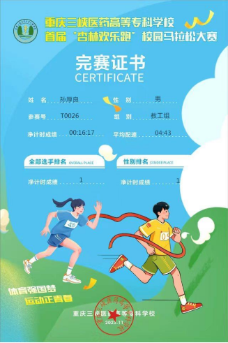 11月28日,我校举办的“体育强国梦 运动正青春”重庆三峡医药高等专科学校首届“杏林欢乐跑”校园马拉松大赛圆满落幕。在激烈的竞争中,我部孙厚良教授以其出色的表现,成功夺得教师组一等奖。
