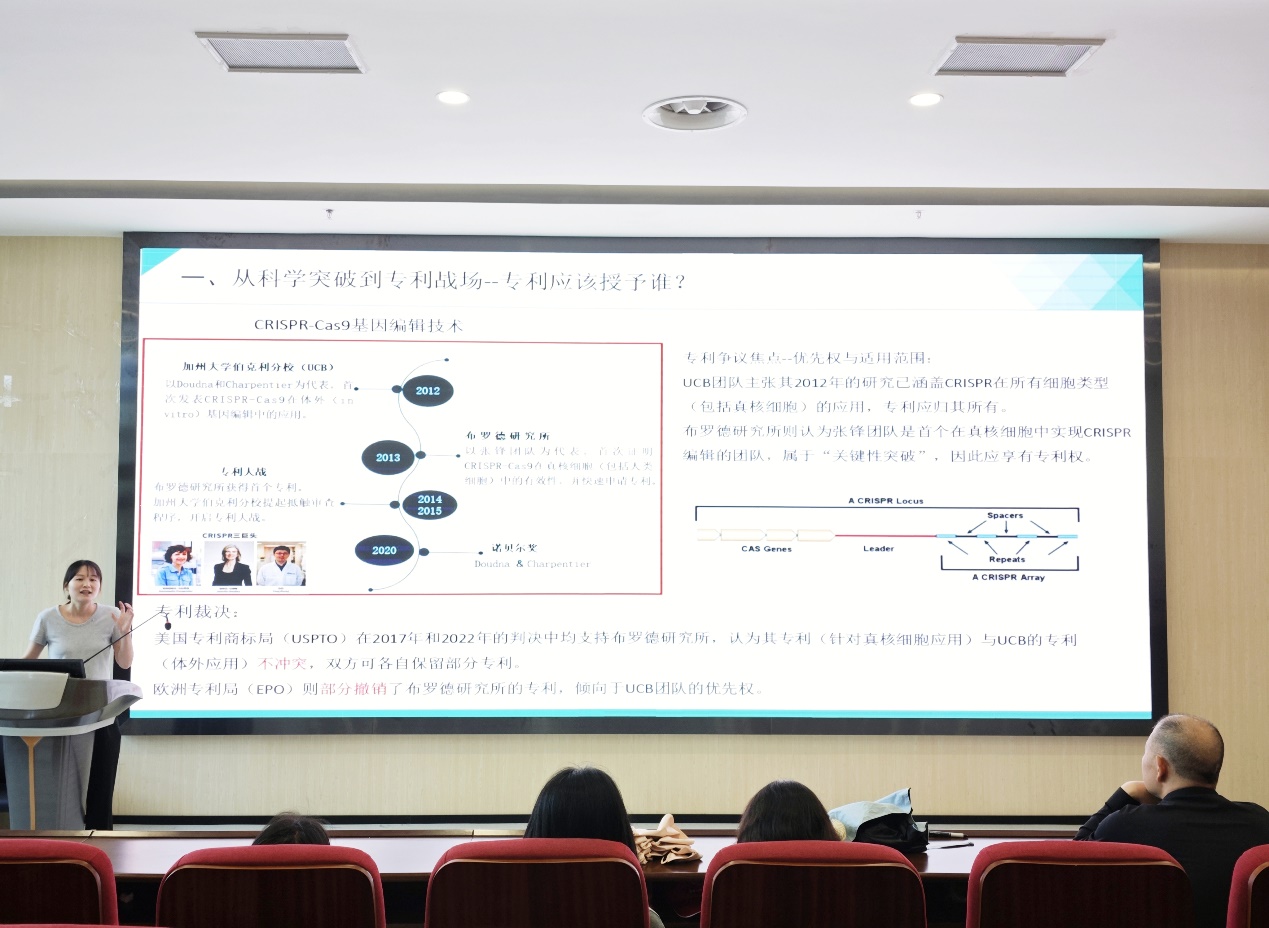 讲座中,樊安莲老师以CRISPR-Cas9基因编辑技术的专利争夺战为切入点,深入剖析了专利优先权与适用范围的核心争议,凸显了专利布局在生物医药领域的战略意义。随后,她详细介绍了专利、商业秘密、商标等知识产权类型在保护核心创新成果中的应用,并通过实际案例展示了不同策略的实施效果。最后,樊老师还分享了专利申请的流程与实务技巧,强调了专利性评估、申请文件撰写及策略规划的重要性。