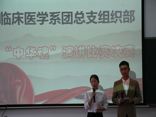 为了贯彻落实“十八大”精神及深入践行科学发展观,引导我系广大学生深刻认识社会主义核心价值体系,增强民族自尊心、自信心和自豪感,树立正确的世界观、人生观、价值观和崇高的社会理想,临床医学系特为同学们提供了一个展示自我的舞台——于2016年4月中旬至5月中旬举办“中华魂”征文与演讲比赛,并于2016年5月20日在第二教学楼302顺利举行“中华魂”演讲决赛。临床医学系团总支书记余浩、辅导员田秀蓉等老师受邀担任比赛嘉宾及评委工作,200余名同学积极参与了此次活动。