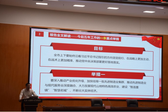 陈地龙系统解读了会上陈敏尔书记代表中共重庆市第五届委员会向大会作的题为《沿着习近平总书记指引的方向坚定前行,推动高质量发展创造高品质生活,奋力书写重庆全面建设社会主义现代化新篇章》的报告,报告指出重庆过去的五年的工作是极不寻常的,过去五年奋斗所取得新成就是有目共睹的,分析了重庆目前的优势和机遇,展望了今后五年工作的目标和思路,提出了要勇于自我革命,加强全面从严治党。
