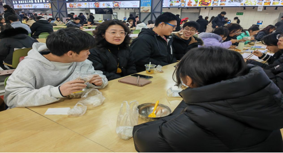 师生同桌用餐,朱晓兰与学生们一同在学生食堂就餐,在就餐过程中,她通过询问学生们是否吃得饱、食堂价格贵不贵、饭菜是否好吃等问题,了解到了同学们的日常饮食,并希望大家养成健康饮食的好习惯。