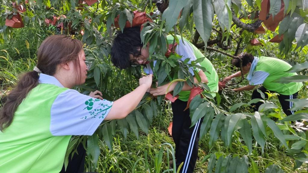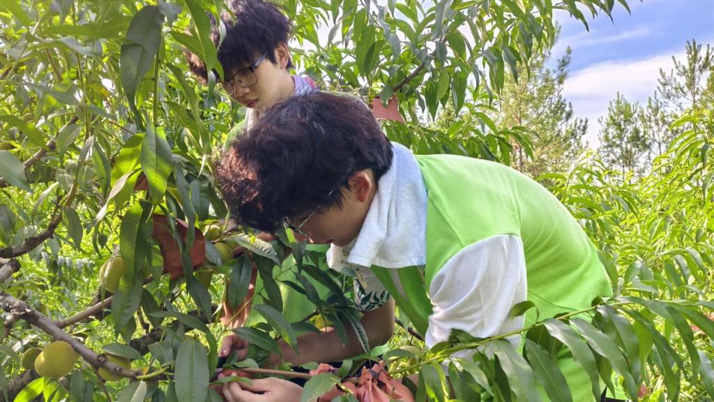 据了解,黄桃产业是当地乡村振兴的支柱产业,更是农民增收的"金钥匙"。通过套袋技术,不仅能有效防治病虫鸟害、减少农药残留,更能显著提升果品品质和商品价值。当前正值套袋关键期和李子采收季,时间紧、任务重,劳动力短缺成为困扰果农的难题。服务团的到来,不仅帮助果农抢抓农时,更在劳动实践中深化了对现代农业的认知。
