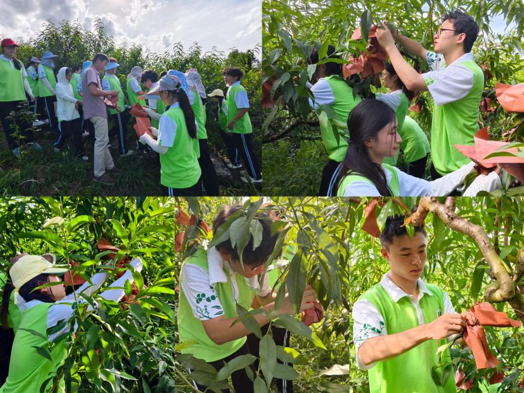 志愿服务团将思政课堂搬到乡村振兴的现场,以亲身体验践行新时代青年的使命担当。在长滩镇的果园里,同学们迅速切换身份,化身专业的“果树护理员”与娴熟的“采摘能手”。他们顶着灼灼烈日,穿梭在枝繁叶茂的果树间,一丝不苟地为黄桃套上“防护衣”,又小心翼翼地将成熟的李子摘入筐中,用汗水浇灌着田间地头的希望。未来,志愿服务团将继续以青春之力深耕实干,让蓬勃青春在祖国最需要的地方绽放出绚丽夺目的光彩。