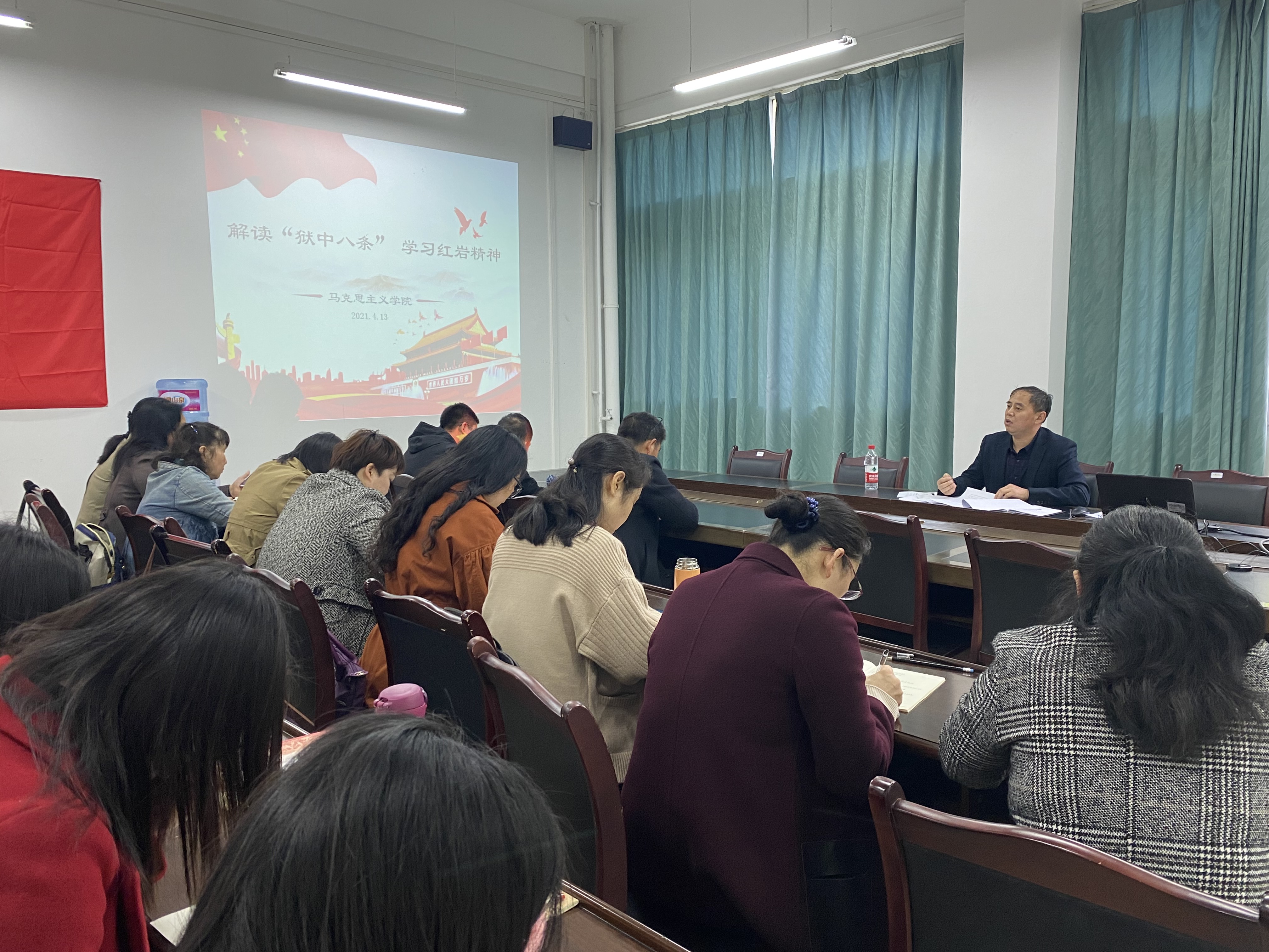 为推进习近平新时代中国特色社会主义思想和党的十九大精神“三进”工作,深入学习贯彻习近平总书记关于红岩精神和“狱中八条”的重要指示,4月13日下午马克思主义学院直属党支部在学院307会议室开展解读“狱中八条”,学习红岩精神的政治理论学习,学院全体党员和全体教师参加。