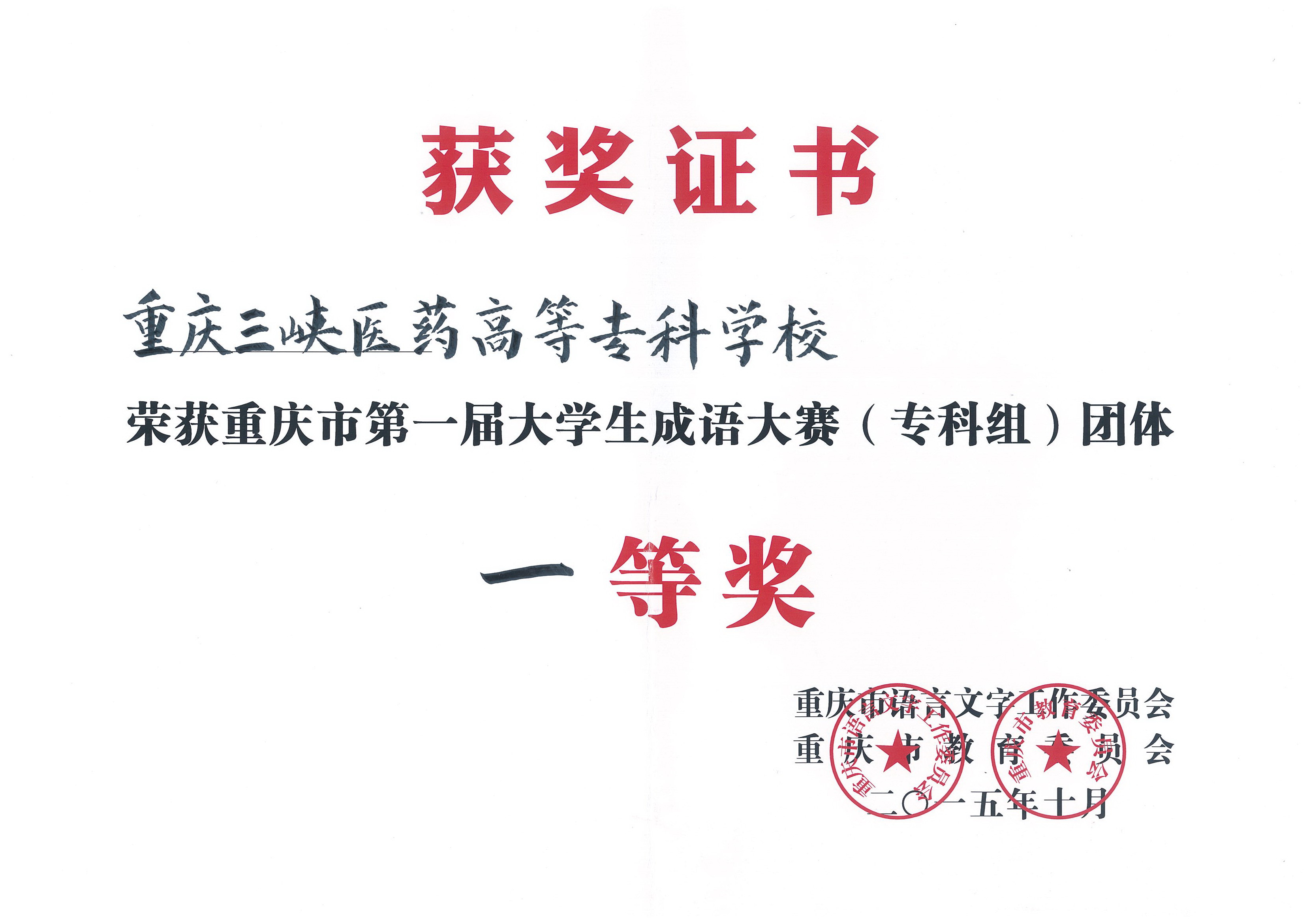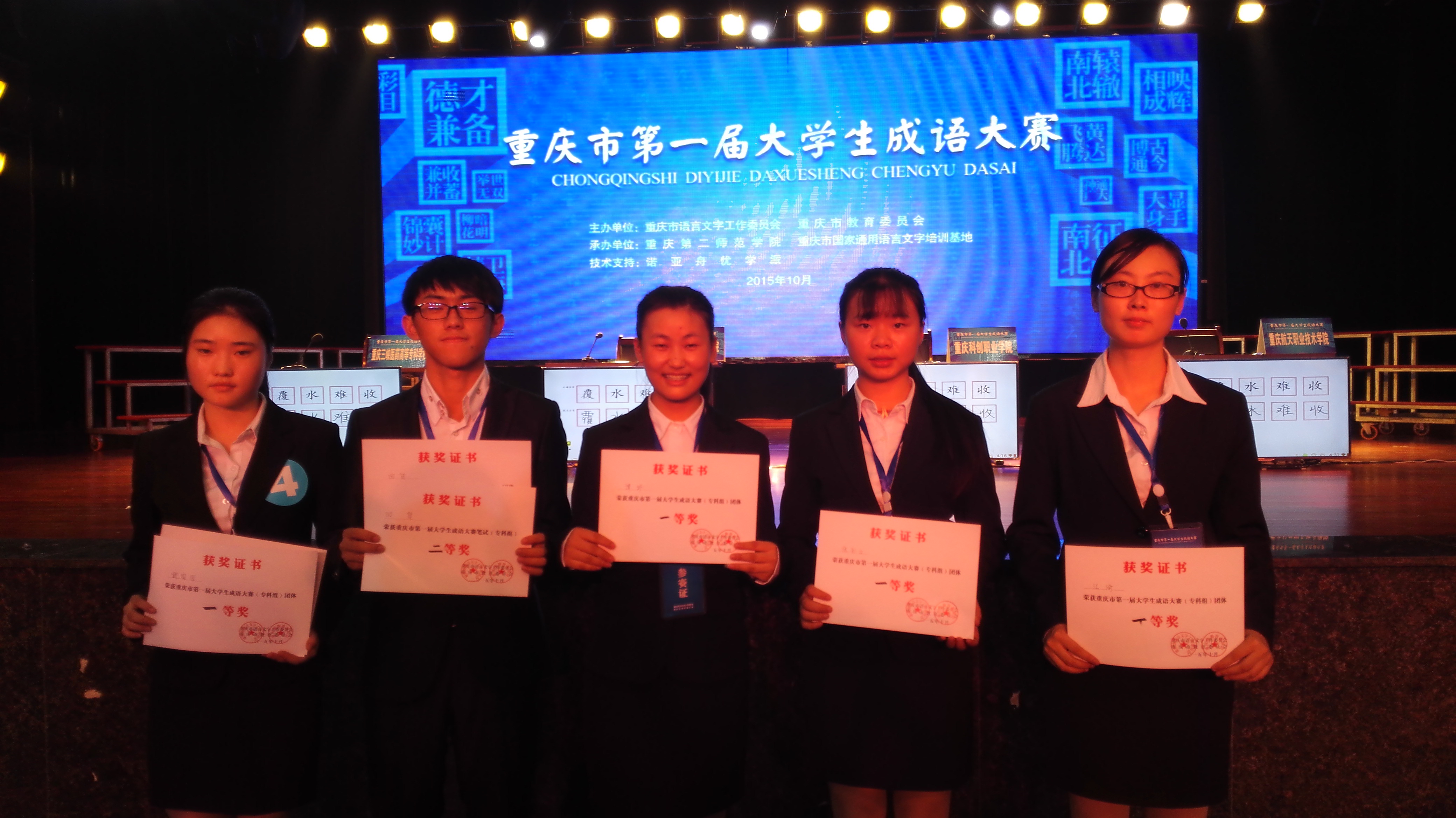 我校代表队在重庆市第一届大学生成语大赛中过关斩将,荣获专科组团体一等奖;谭坪、田贺、戴园园三位同学还分别获得个人二等奖。