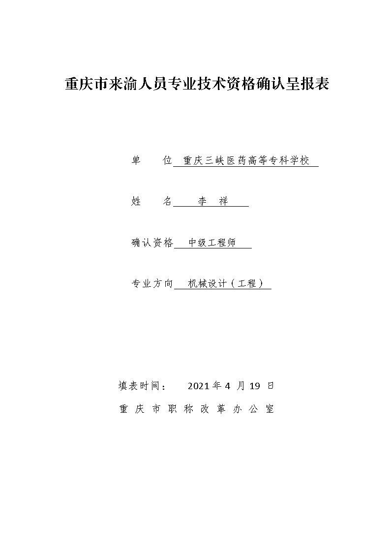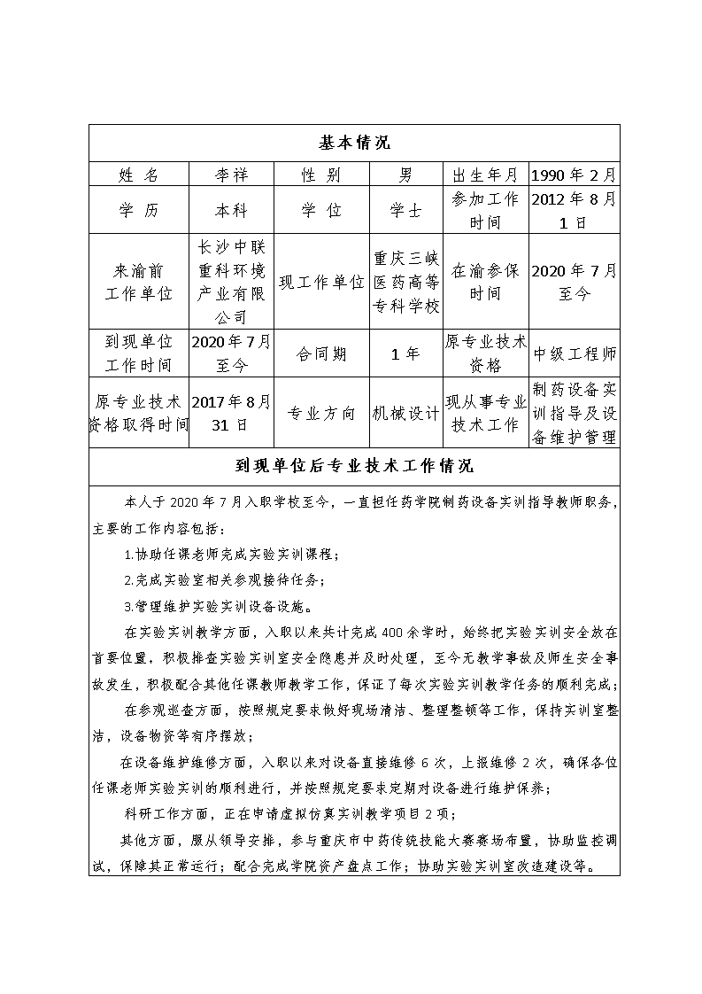 重庆三峡医药高等专科学校关于李祥同志专业技术资格的公示