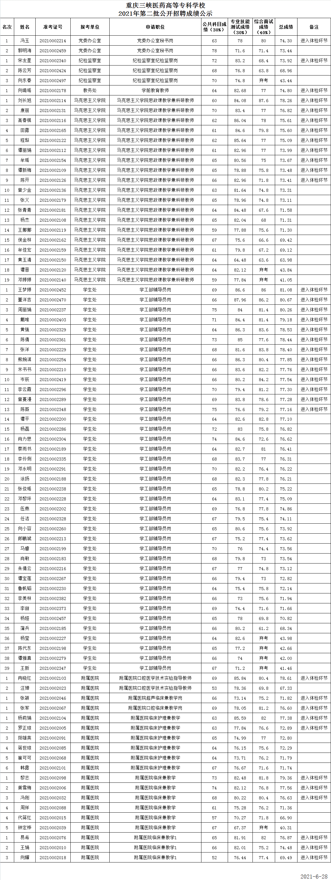 2021年第二批公开招聘成绩公示