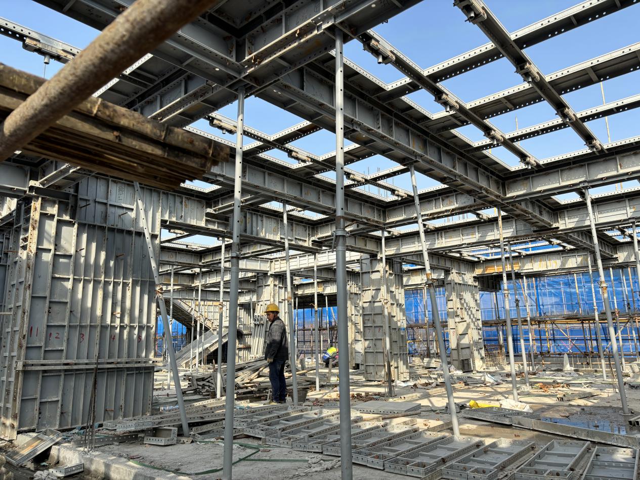 四工区:8#楼斜屋面梁板混凝土浇筑完成;9#楼屋面9-12轴梁板钢筋制安80%;10#楼3F梁板模板制安完成80%;11#楼地面保温完成100%;12#、13#、14#主体结构施工至3F;17#楼负一层地梁混凝土浇筑完成100%,-0.5m标高独基钢筋制安完成20%。