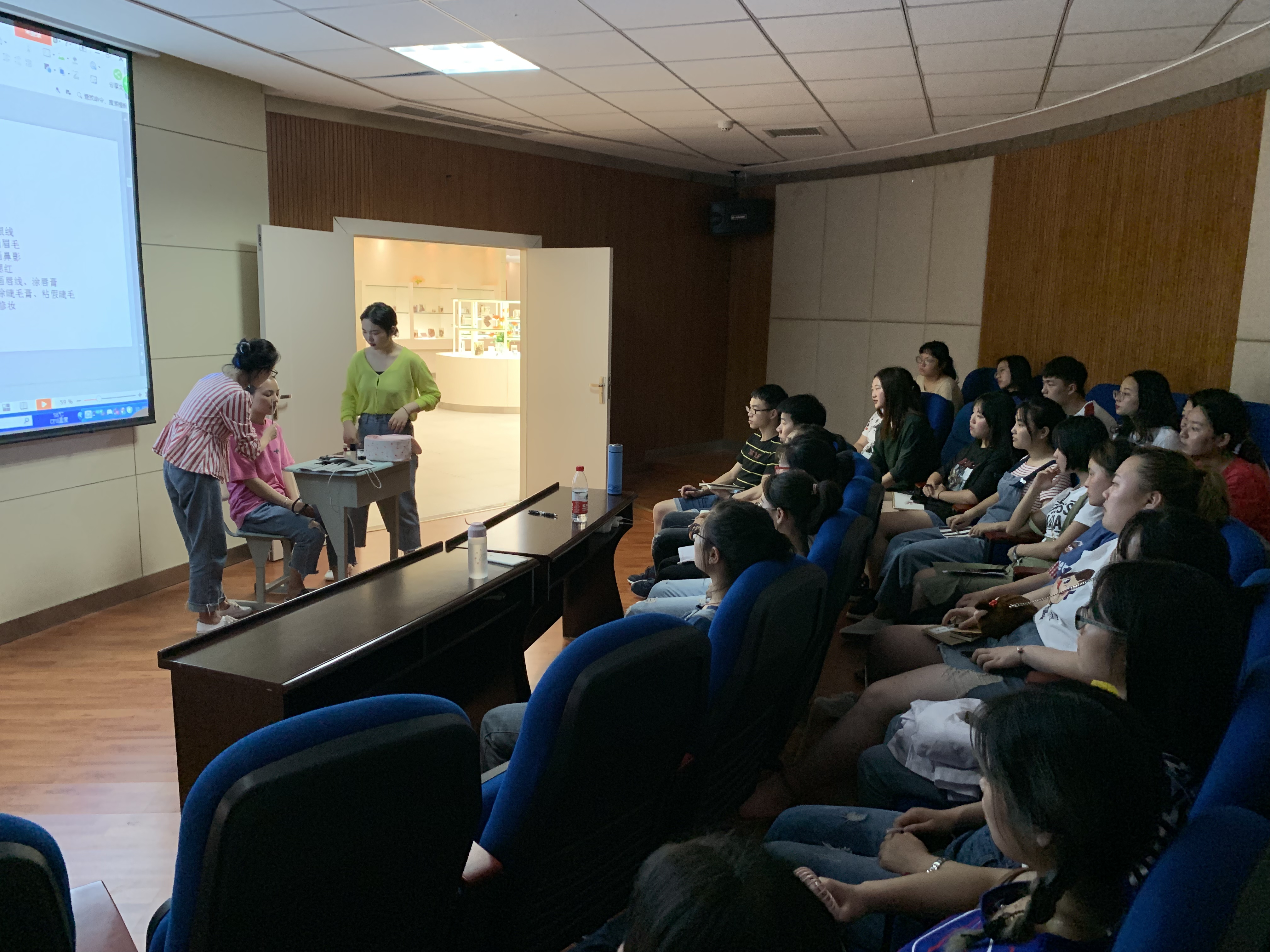 仪容仪表干净、整洁、美丽、得体、大方,在生命科学馆的日常接待中,是对参观者最基本的尊重和礼貌,是个人良好素质的体现。为加强生命科学馆科普讲解员的自身形象建设,提升综合社会服务水平,塑造良好的场馆形象和个人形象,生命科学馆于2019年4月25日晚在馆内多媒体教室开展化妆技巧专题培训。培训全程由中医学院医美教研室刘子琦老师主讲,生命科学馆大一预备讲解员及中药科技馆、三峡中医药文化馆有兴趣的讲解员参加了培训。