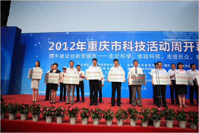 5月19日,以“携手建设创新型城市—走近科学、体验科技,走进民众、普惠民生”为主题的2012年重庆市科技活动周在九龙坡区巴国城隆重开幕。市人大常委会副主任陈雅棠出席开幕式并宣布了2012年重庆市科技活动周开幕,市政府副市长吴刚致开幕辞,市政府副秘书长涂经平宣读了命名重庆市科普基地的通知。本次命名的重庆市科普基地共有12家,我校生命科学馆也在这批新命名的科普基地之列,副校长袁定明代表我校在开幕式上参加了“2012年命名的12家重庆市科普基地授牌仪式”活动。