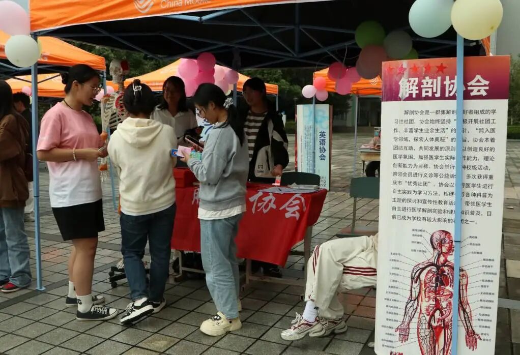 活动现场热闹非凡,思想政治类、学术科技类、文化体育类、创新创业类、志愿公益类、自律互助类、医学专业类七大类的50余名社团各展风采,吸引了一千余名新生积极参与,社团共计招募到近九百名同学的加入,生动展现了我校学子的蓬勃朝气与校园文化丰富多彩。