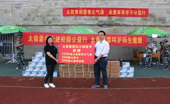 活动现场,太极集团向我校军训现场捐赠了千古一方——太极集团藿香正气液1200盒、9.3大阅兵参训官兵指定用水——太极水240罐、太极香菇酱200瓶。