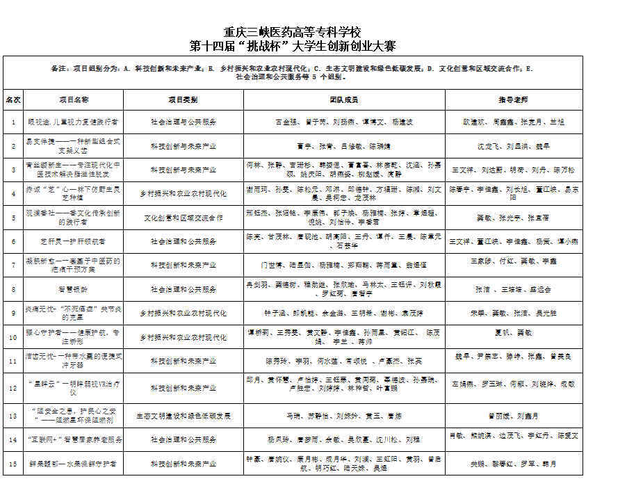 各项目经过自主申报、院部初赛、资料审核、评委专家匿名盲审、路演答辩等环节,根据校内选拔赛评审的综合得分,拟推荐得分前15名的作品参加十四届“挑战杯”中国大学生创业计划竞赛重庆市赛。根据《“挑战杯”中国大学生创业计划竞赛章程》具体要求,现对项目信息予以公示(名单详见附件)。