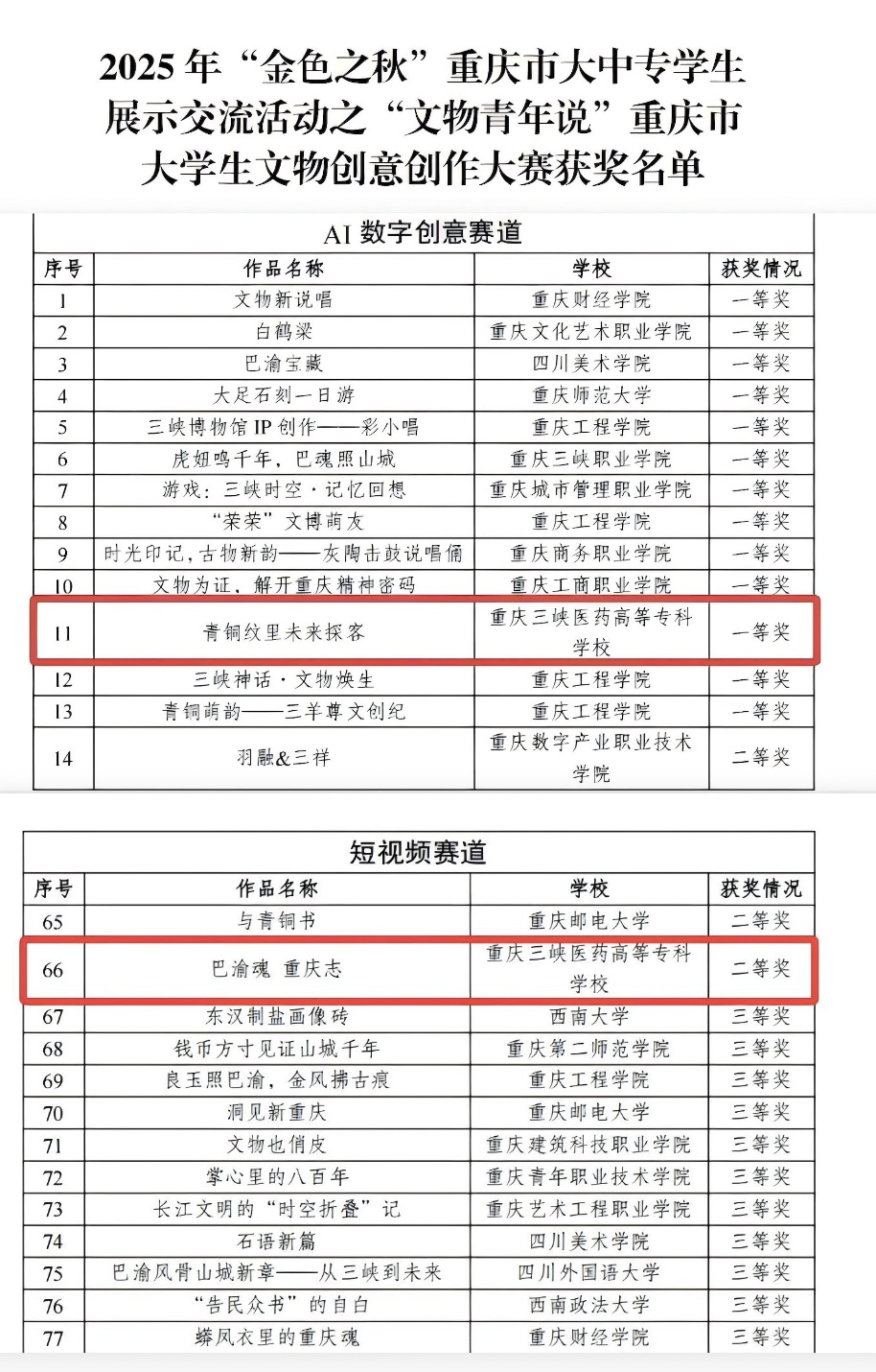 本次大赛汇聚重庆市48所高校的851件参赛作品,涵盖短视频、动画、AI数字创意三大赛道,其中37%的作品运用了3D修复、元宇宙展陈等前沿技术,充分彰显青年学子对文化遗产保护的创新思考。经初赛选拔,219支团队进入决赛,临床医学院学生作品《青铜纹里未来探客》荣获AI数字创意赛道一等奖,医学技术学院学生作品《巴渝魂 重庆志》获短视频赛道二等奖,展现了我校学子在文化传承与数字技术创新领域的突出实力。