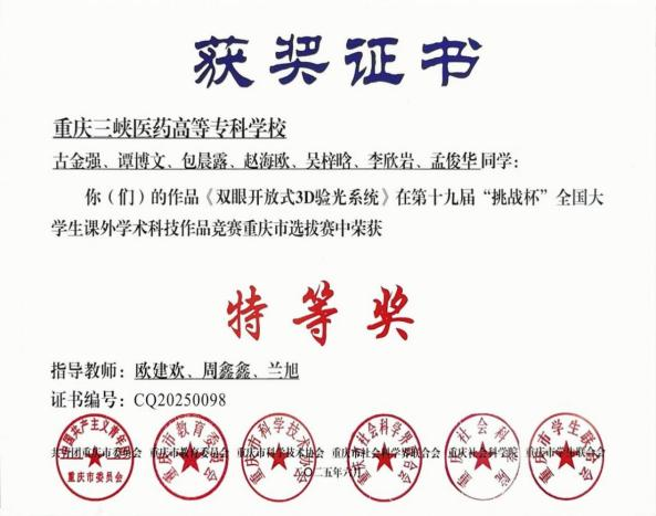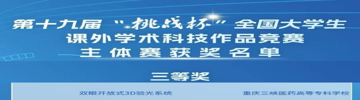 近日,第十九届“挑战杯”全国大学生课外学术科技作品竞赛评审结果正式揭晓。我校临床医学院欧建欢老师团队指导的《双眼开放式3D验光系统》项目成功斩获全国三等奖。